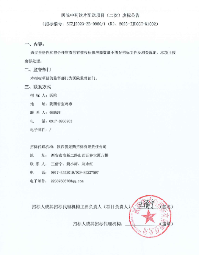 【宝鸡市医院】陕西省宝鸡市医院中药饮片配送项目(二次)废标公告