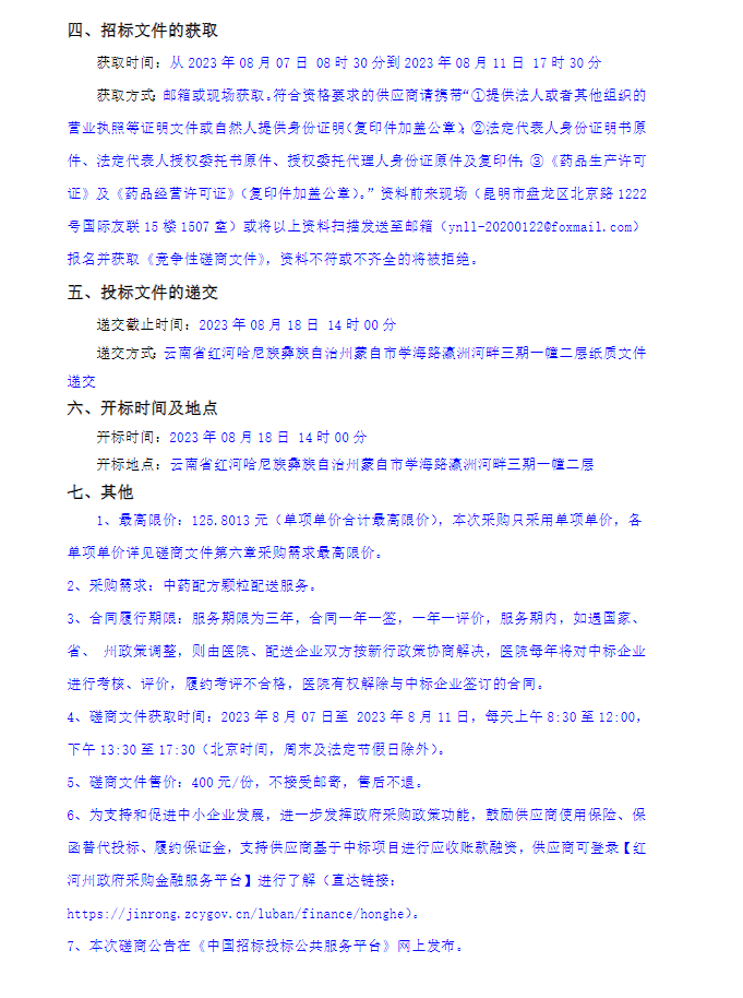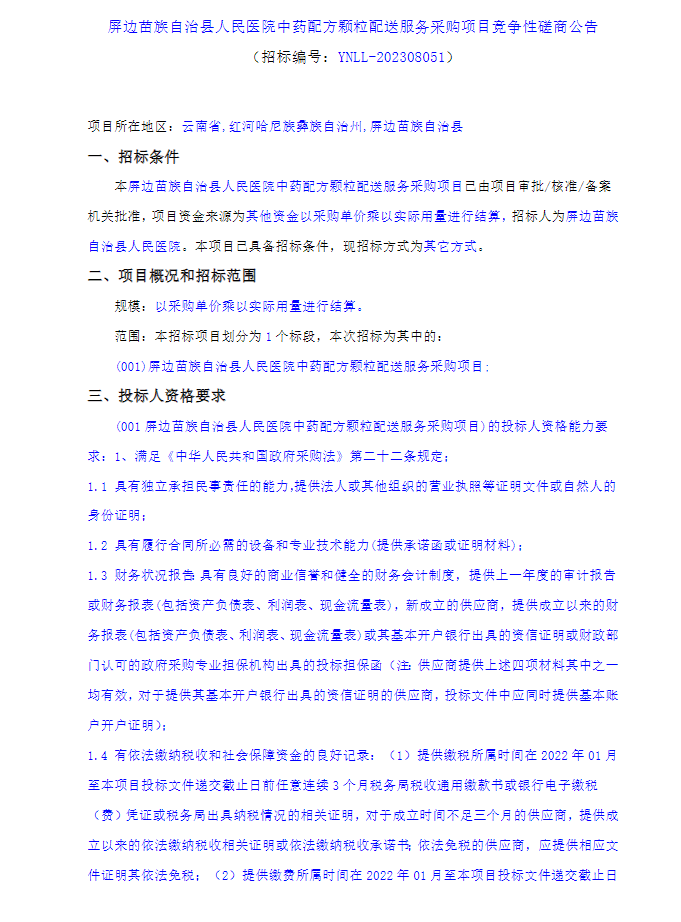 【红河哈尼族彝族自治州屏边苗族自治县人民医院】云南省红河哈尼族彝族自治州屏边苗族自治县人民医院中药配方颗粒配送服务采购项目竞争性磋商公告