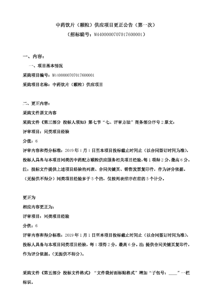 【佛山市人民政府门诊部】广东省佛山市人民政府门诊部中药饮片(颗粒)供应项目更正公告(第一次)