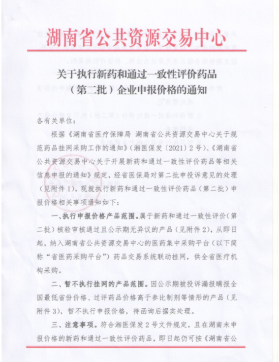 【湖南】2021年湖南省关于执行新药和通过一致性评价药品(第二批)企业申报价格的通知