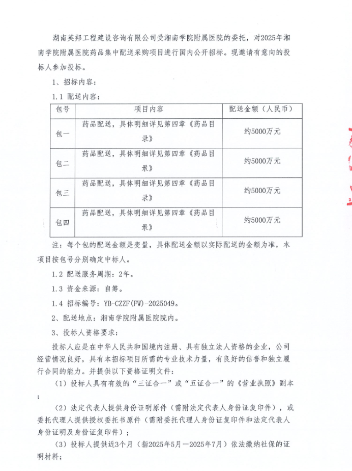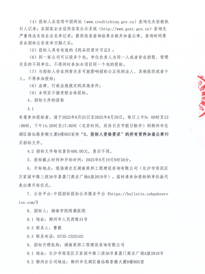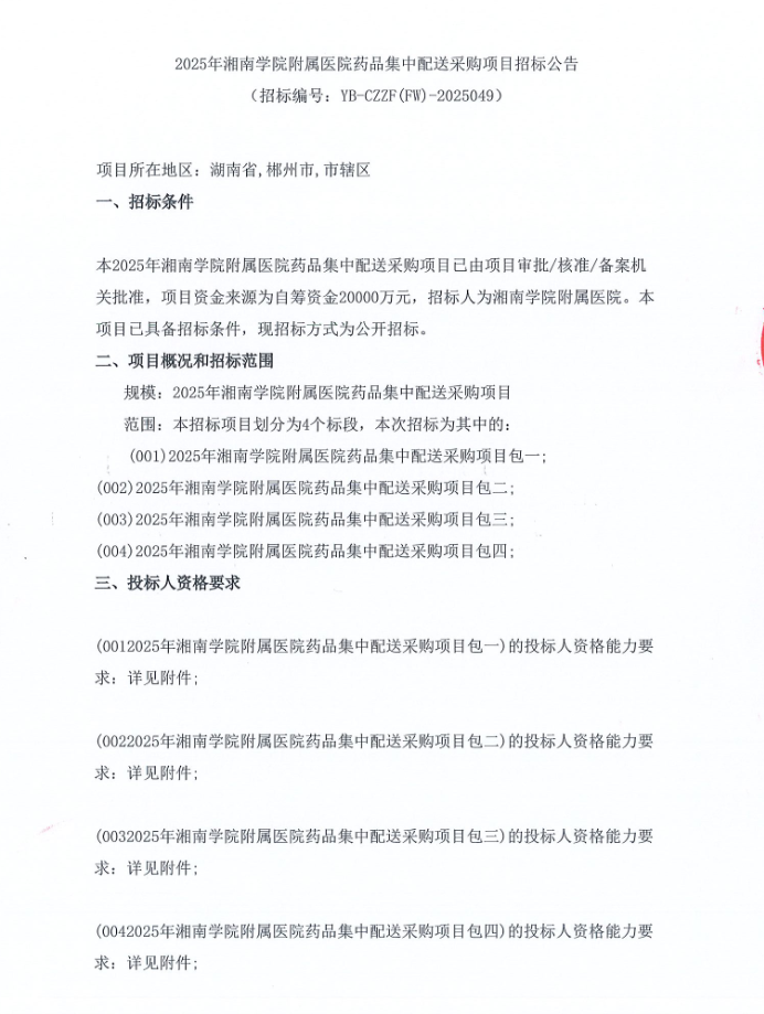 【郴州市湘南学院附属医院】湖南省2025年湘南学院附属医院药品集中配送采购项目招标公告