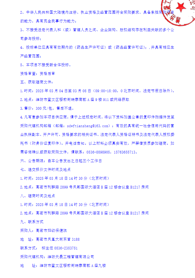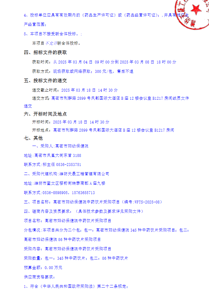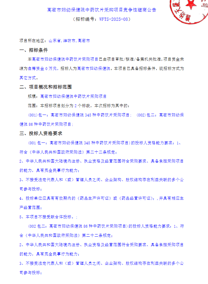 【潍坊市高密市妇幼保健院】山东省潍坊市高密市妇幼保健院中药饮片采购项目竞争性磋商公告
