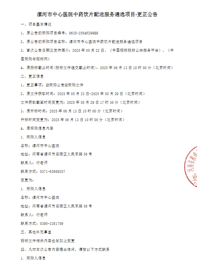 【漯河市中心医院】河南省漯河市中心医院中药饮片配送服务遴选项目-更正公告