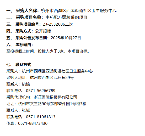【杭州市西湖区西溪街道社区卫生服务中心】浙江国际招投标有限公司关于杭州市西湖区西溪街道社区卫生服务中心中药配方颗粒采购项目(重招)的废标公告