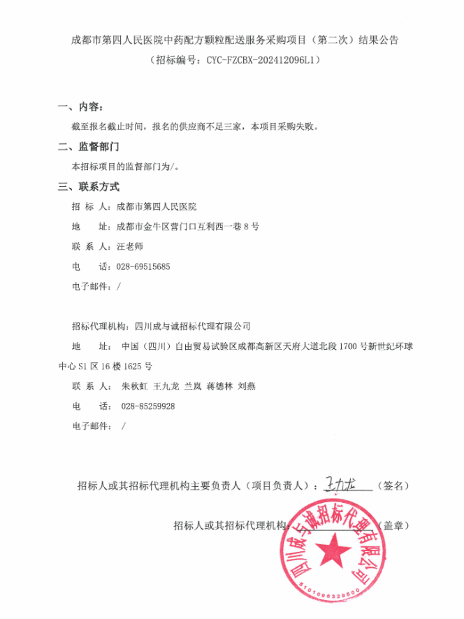 【成都市第四人民医院】四川省成都市第四人民医院中药配方颗粒配送服务采购项目(第二次)结果公告