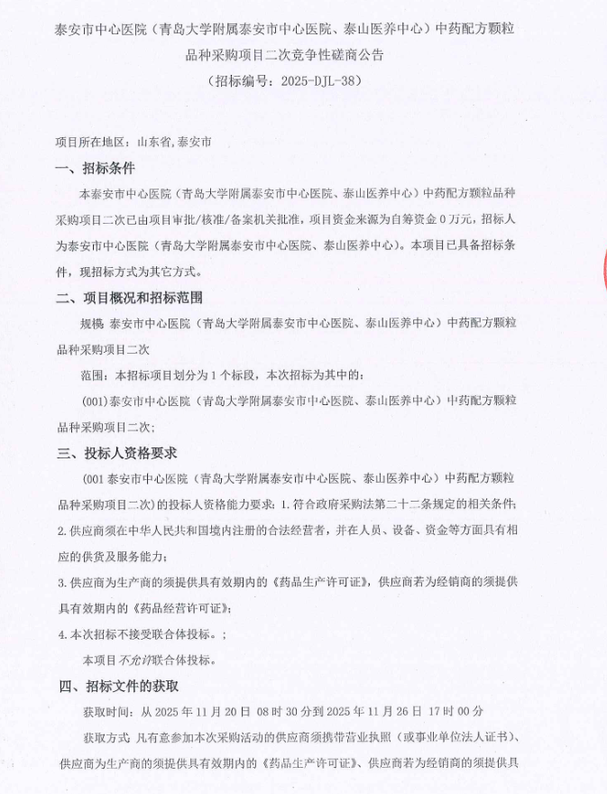 【泰安市中心医院】山东省泰安市中心医院(青岛大学附属泰安市中心医院、泰山医养中心)中药配方颗粒品种采购项目二次竞争性磋商公告
