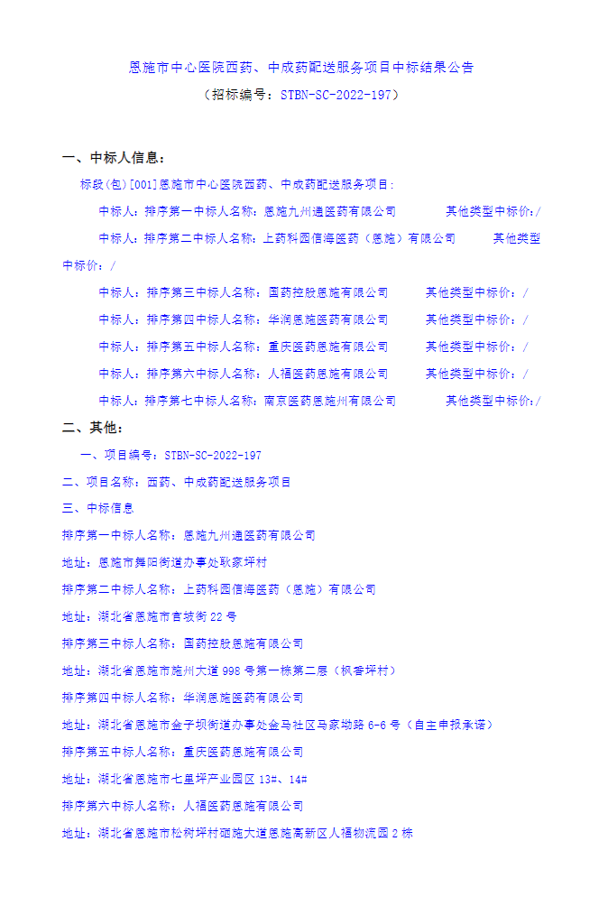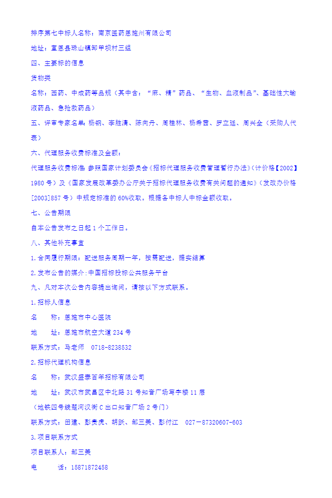 【湖北省恩施市中心医院】西药、中成药配送服务项目中标结果公告