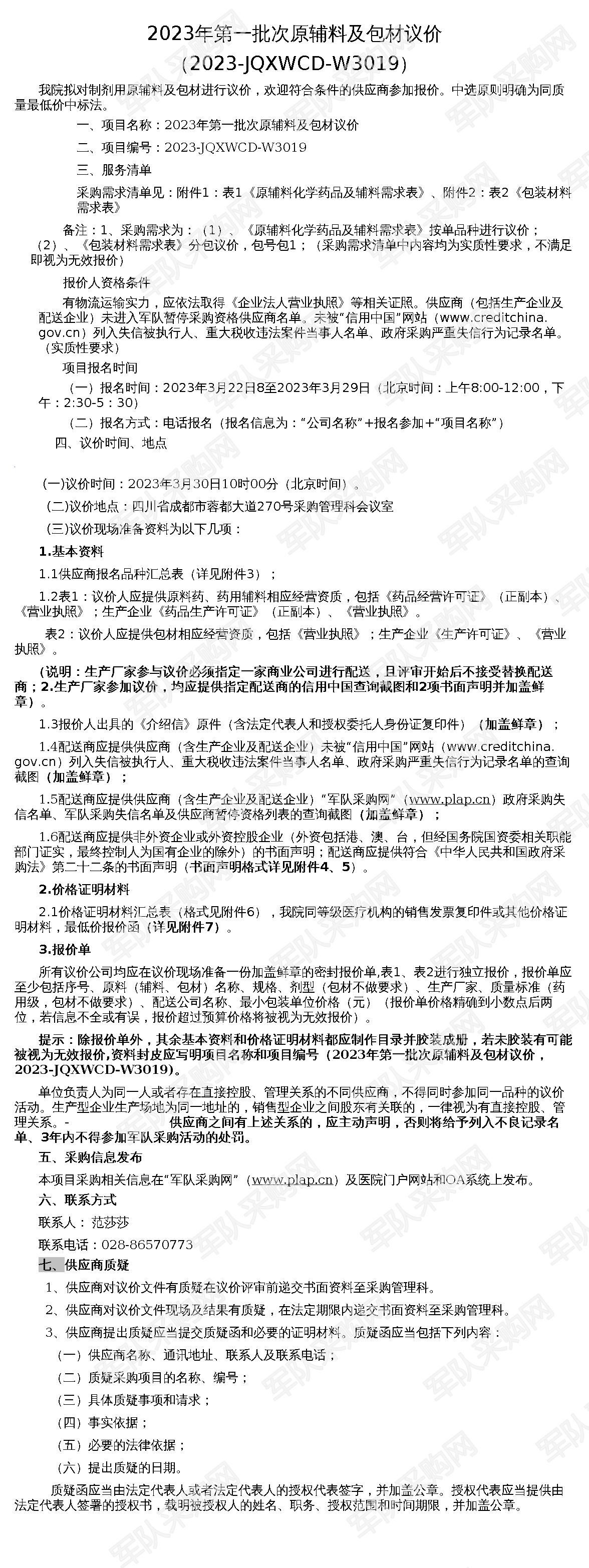 【军队采购】军队采购网2023年第一批次原辅料及包材议价公告(2023-JQXWCD-W3019)