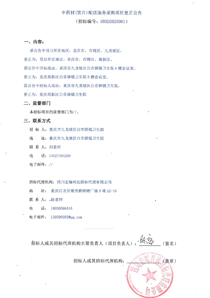 【重庆市九龙坡区白市驿镇卫生院】重庆市九龙坡区白市驿镇卫生院中药材(饮片)配送服务采购项目更正公告