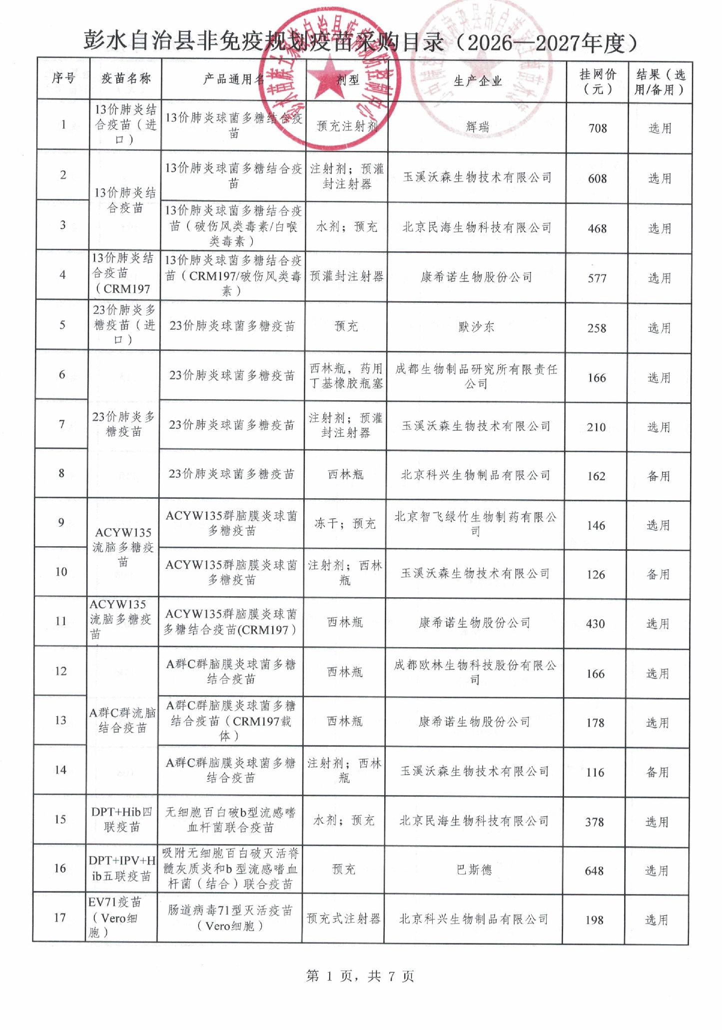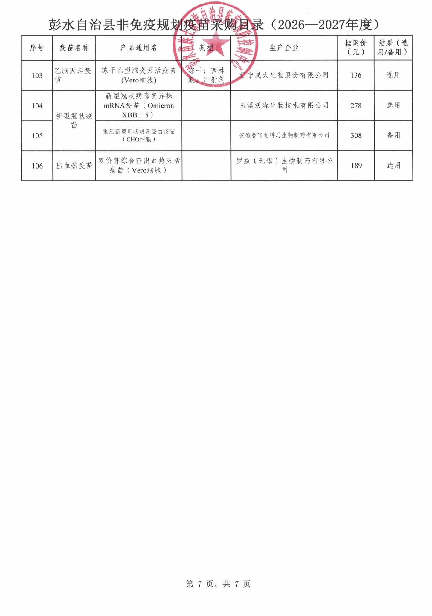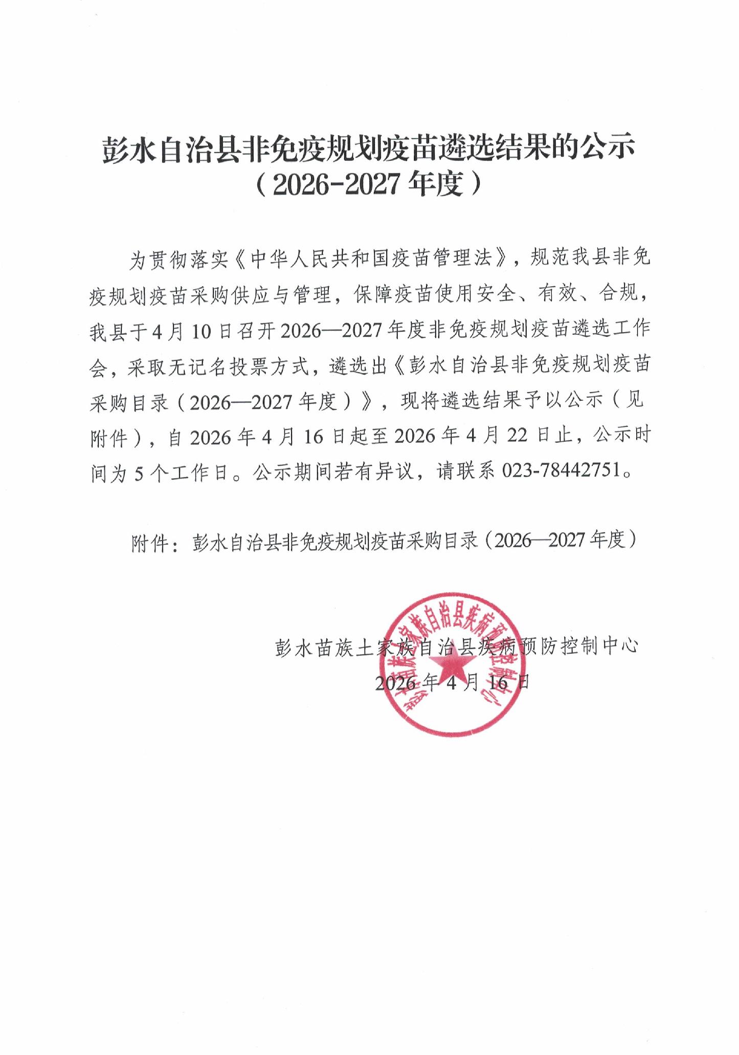 【重庆】彭水自治县非免疫规划疫苗遴选结果的公示(2026-2027年度)
