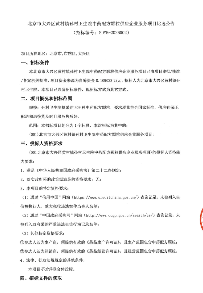 【北京市大兴区黄村镇孙村卫生院】北京市大兴区黄村镇孙村卫生院中药配方颗粒供应企业服务项目比选公告