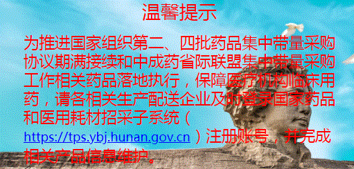 为推进国家组织第二、 四批药品集中带量采购协议期满接续和中成药省际联盟集中带量采购工作相关药品落地执行,保障医疗机构临床用药,请各相关生产配送企业及时登录国家药品和医用耗材招采子系统(htts://tps.ybj.hunan.gov.cn )注册账号,并完成相关产品信息维护。