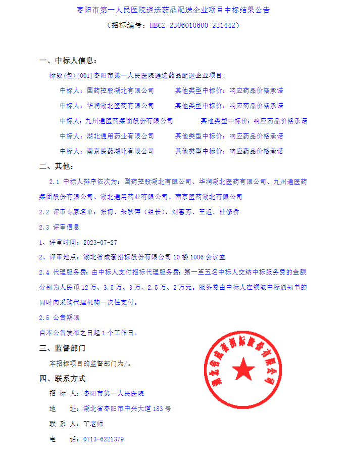 【枣阳市第一人民医院】湖北省襄阳市枣阳市第一人民医院遴选药品配送企业项目中标结果公告