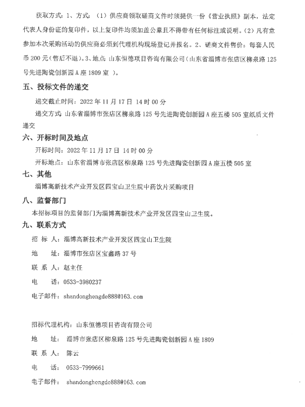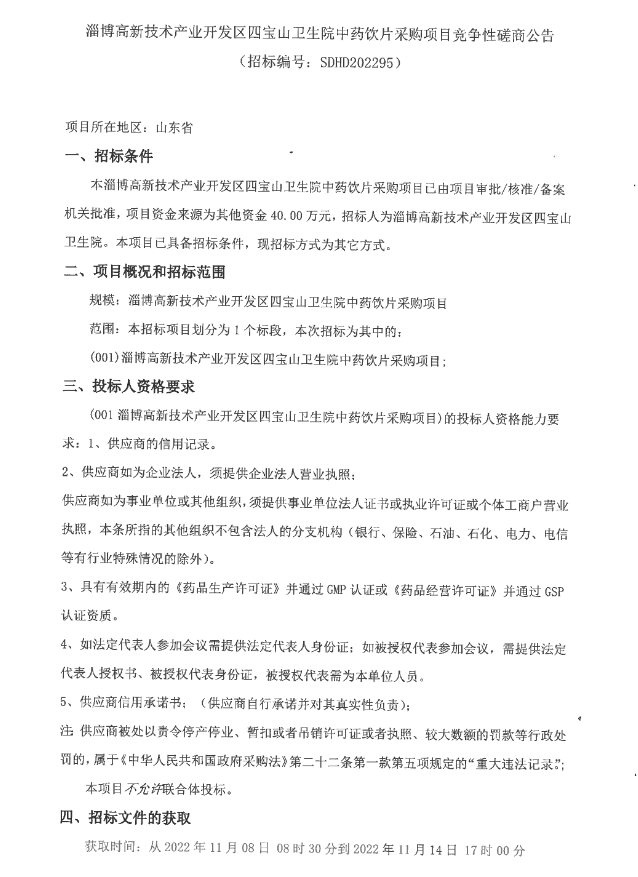 【淄博高新技术产业开发区四宝山卫生院】淄博高新技术产业开发区四宝山卫生院中药饮片采购项目竞争性磋商公告