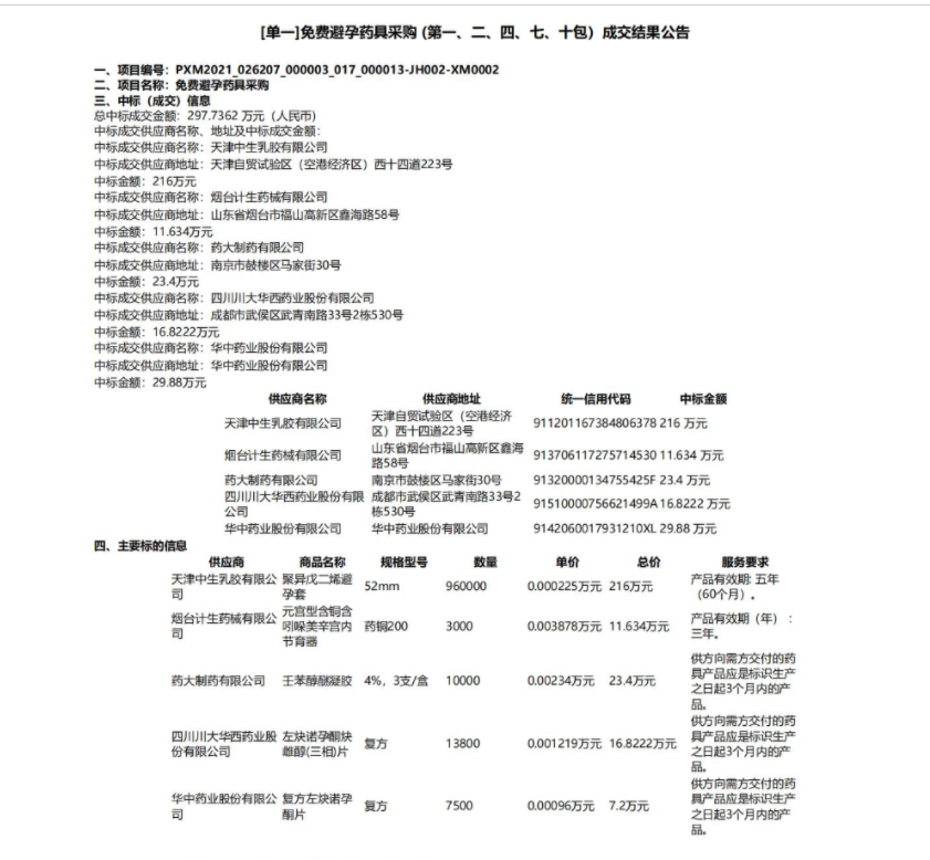 【北京】北京市免费避孕药具采购(第一、二、四、七、十包)成交结果公告