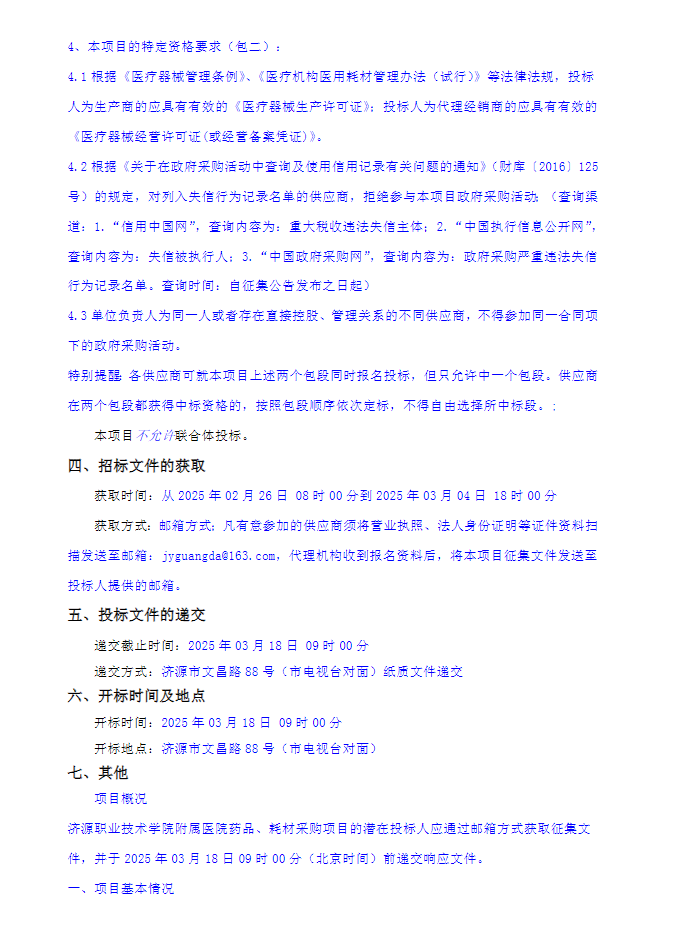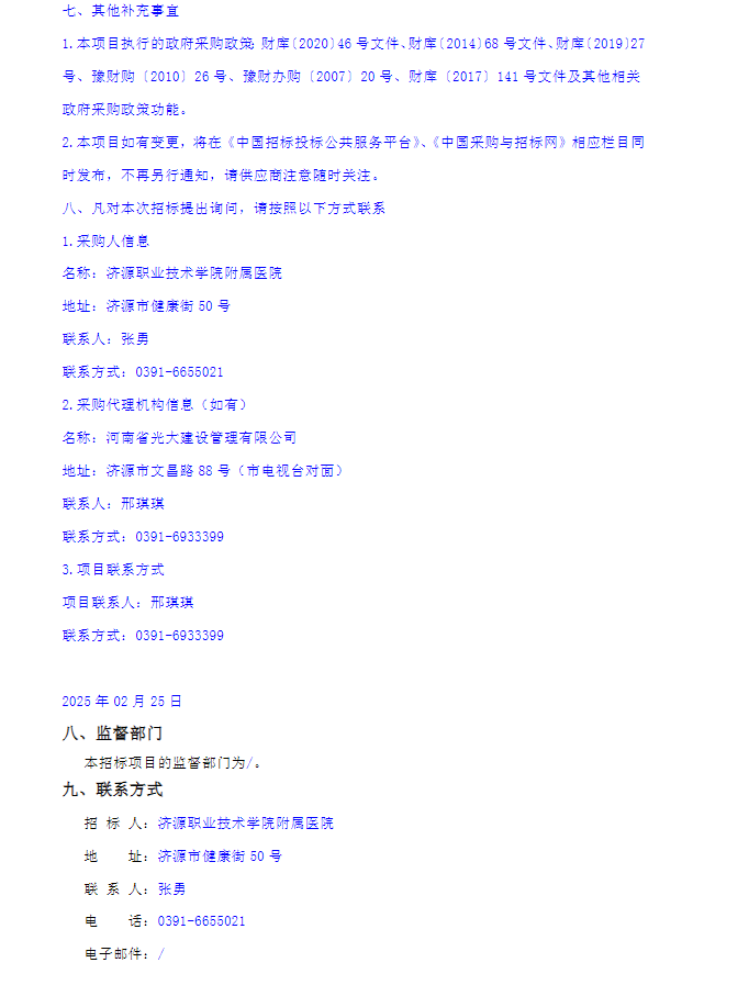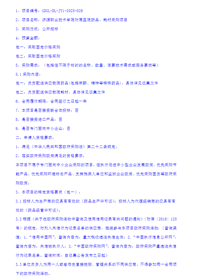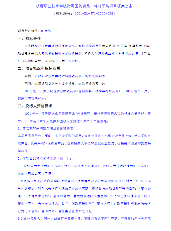 【济源职业技术学院附属医院】河南省济源职业技术学院附属医院药品、耗材采购项目征集公告(20250225)
