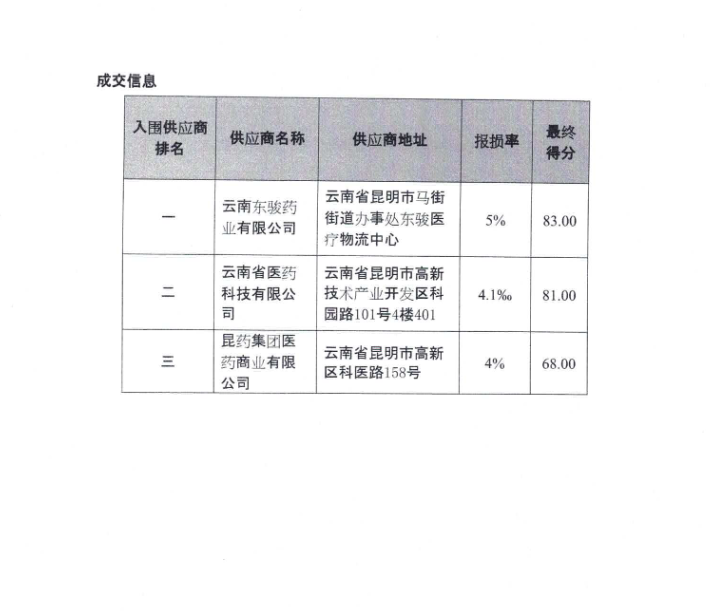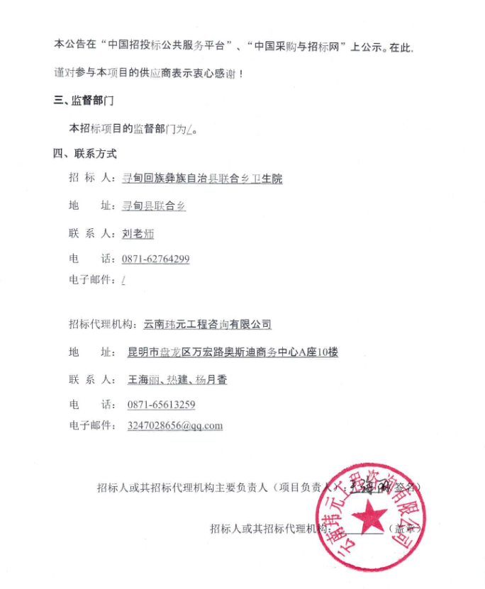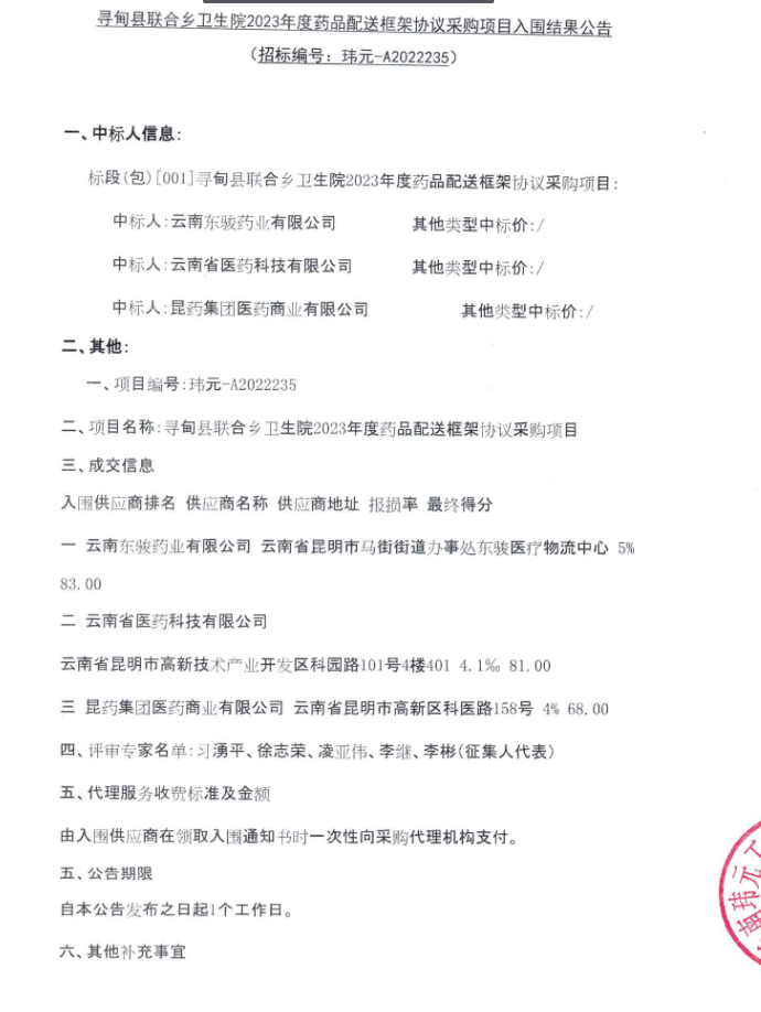 【昆明市寻甸县联合乡卫生院】云南省昆明市寻甸县联合乡卫生院2023年度药品配送框架协议采购项目入围结果公告
