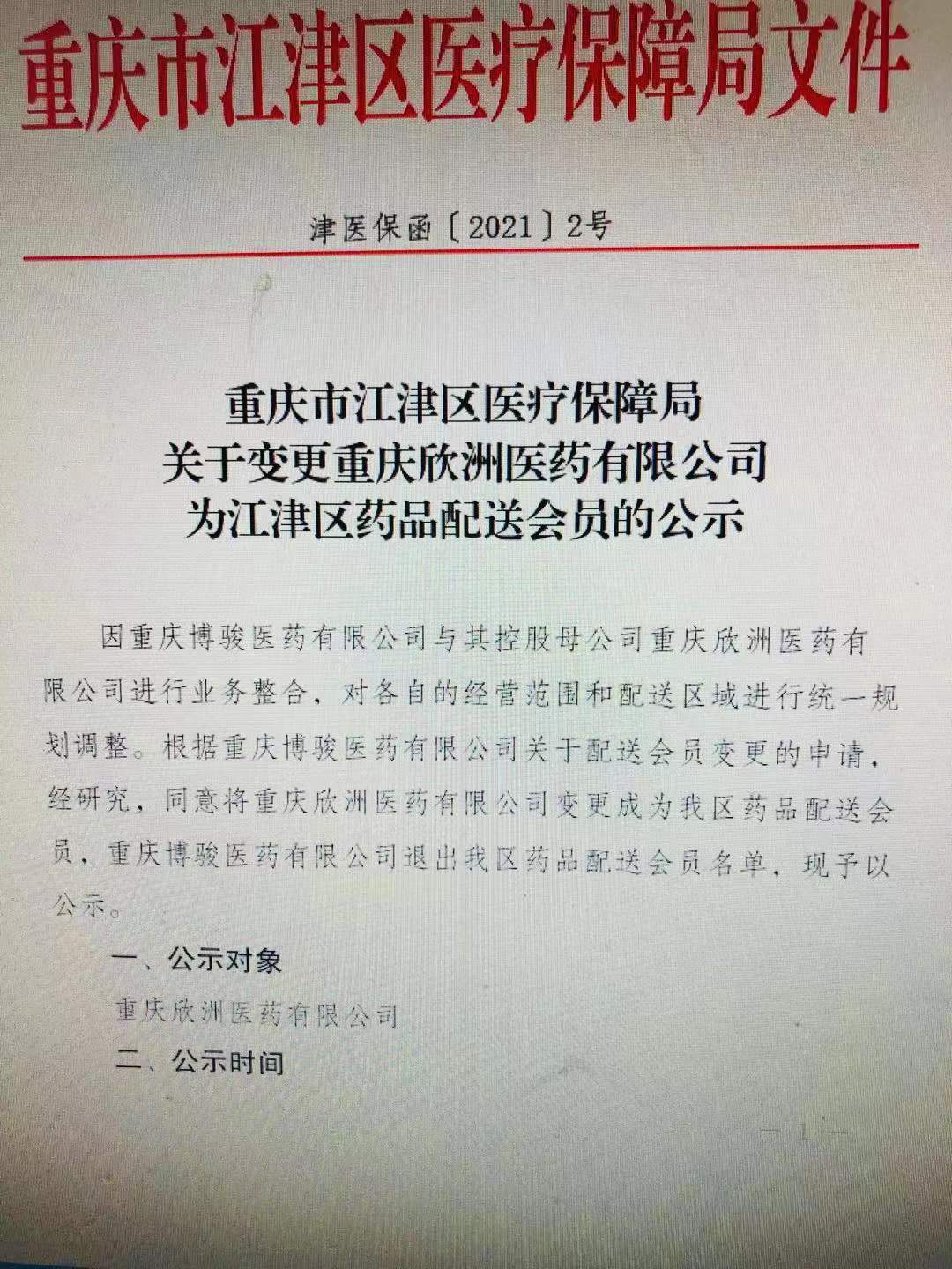 【重庆】重庆市江津区医疗保障局关于变更重庆欣洲医药有限公司为江津区药品配送会员的公示