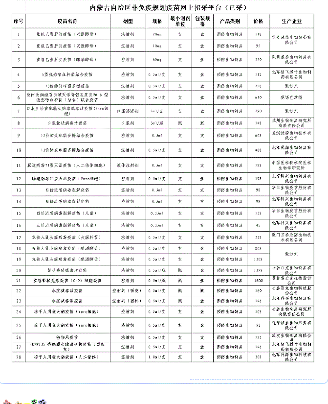为进一步规范全旗非免疫规划疫苗采购管理,保障非免疫规划疫苗供应,防范非免疫规划疫苗在采购、使用过程中发生违法、违规行为,为人民群众提供安全有效、价格合理的非免疫规划疫苗,保障人民群众身体健康,根据《中华人民共和国疫苗管理法》《内蒙古自治区非免疫规划疫苗采购实施方案》等有关规定,按照公开、公平、公正、诚信原则,阿拉善左旗疾病预防控制中心将通过内蒙古自治区非免疫规划疫苗网上招采平台(自治区公共资源交易平台子系统)进行采购。经阿拉善左旗非免疫规划疫苗采购领导小组第一次会议集体决策,现将2025年非免疫规划疫苗采购厂家公示如下: