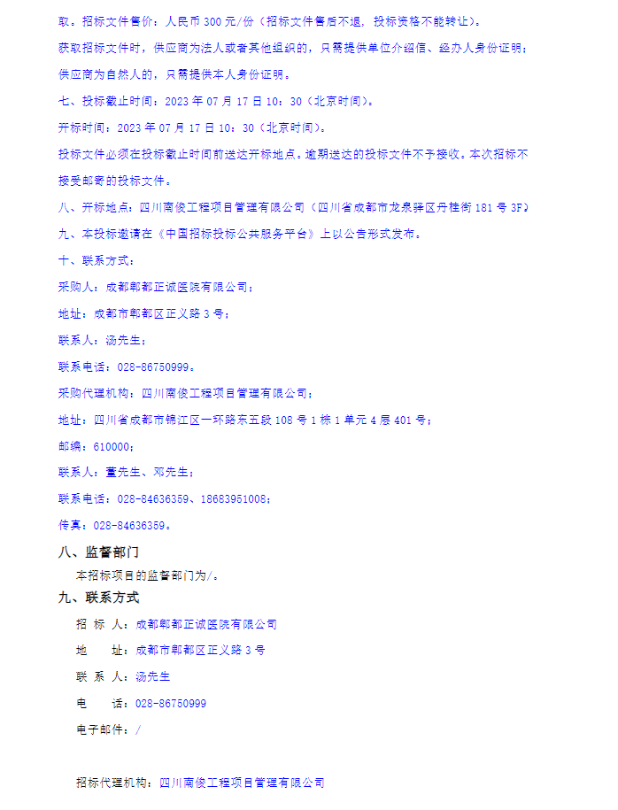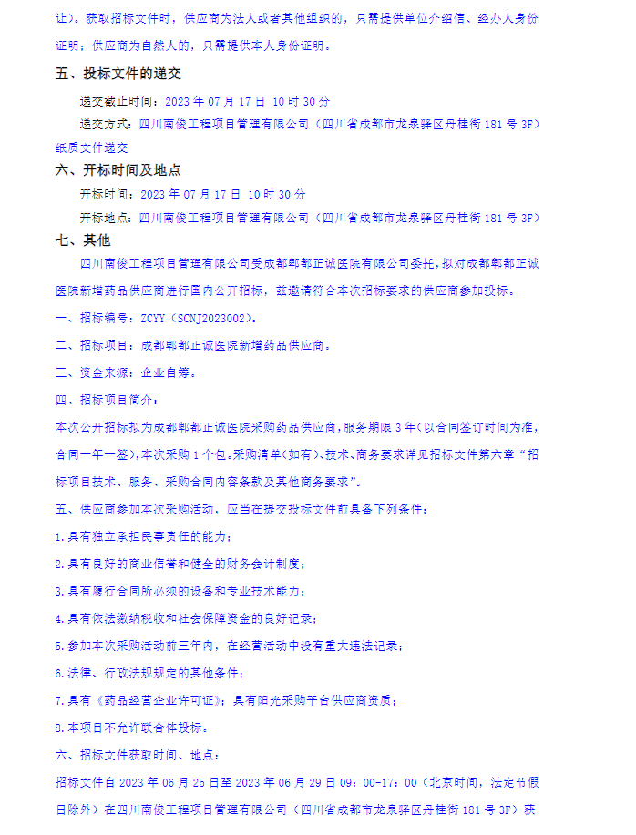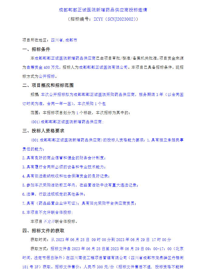 【成都郫都正诚医院】四川省成都郫都正诚医院新增药品供应商投标邀请