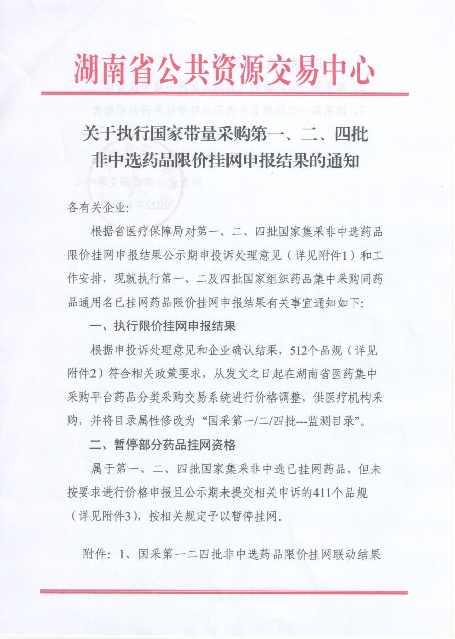 【湖南】湖南省关于执行国家带量采购第一、二、四批非中选药品限价挂网申报结果的通知