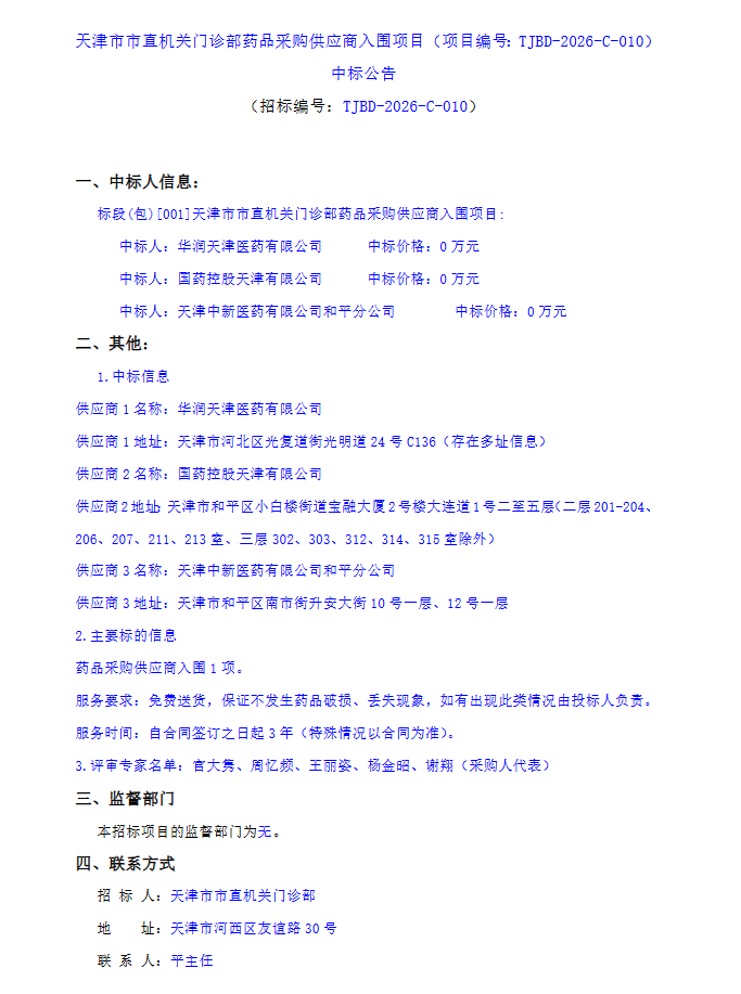 【天津市市直机关门诊部】天津市市直机关门诊部药品采购供应商入围项目(项目编号:TJBD-2026-C-010)中标公告