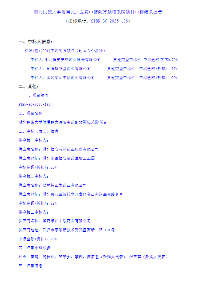 【湖北民族大学附属民大医院】湖北民族大学附属民大医院中药配方颗粒采购项目中标结果公告