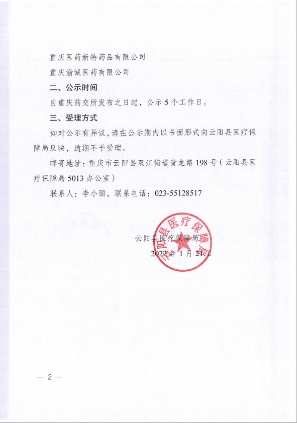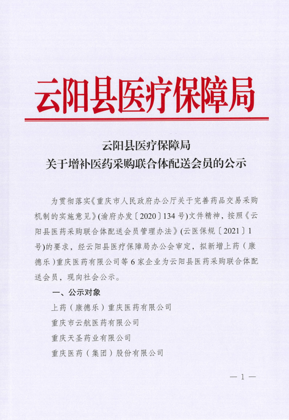 【重庆】重庆市云阳县医疗保障局关于增补医药采购联合体配送会员的公示(20220124)