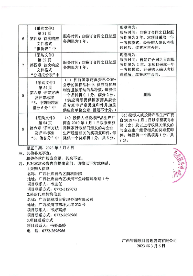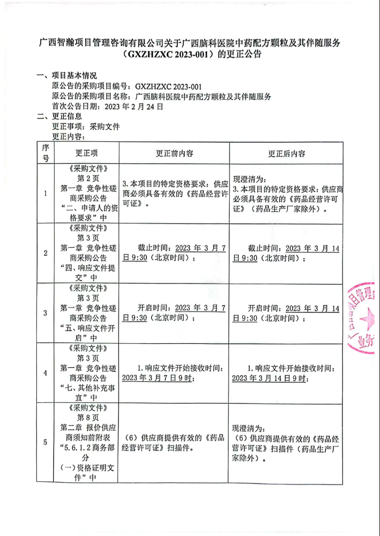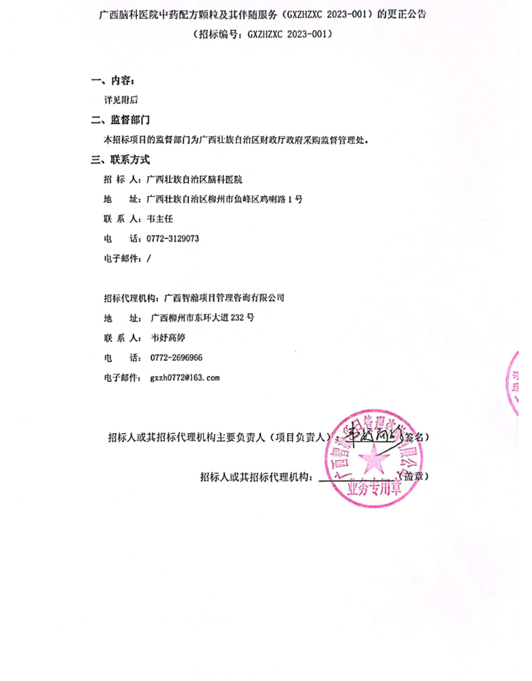 【广西脑科医院】广西脑科医院中药配方颗粒及其伴随服务(GXZHZXC2023-001)的更正公告