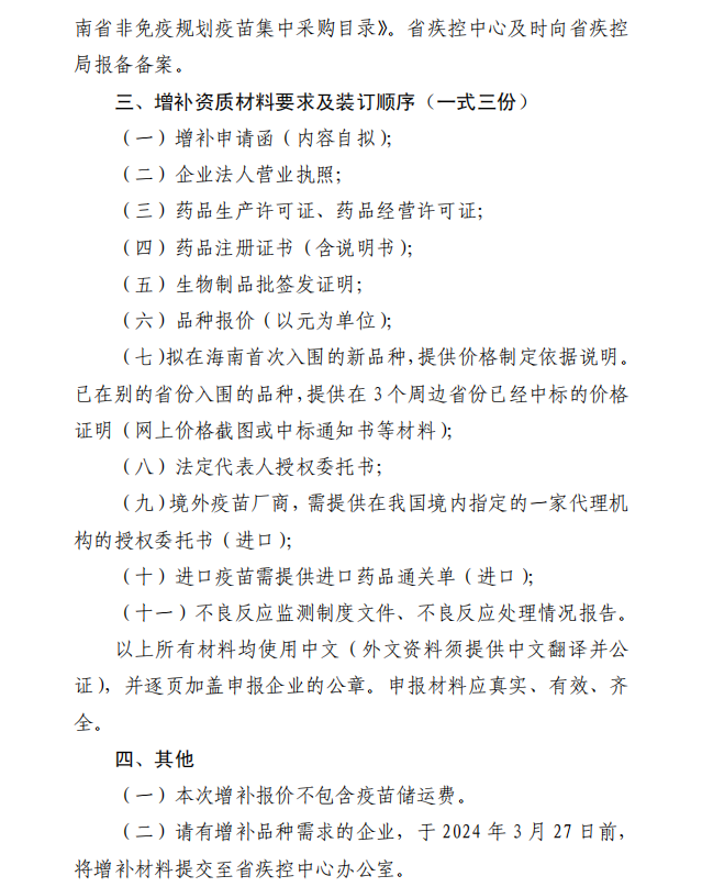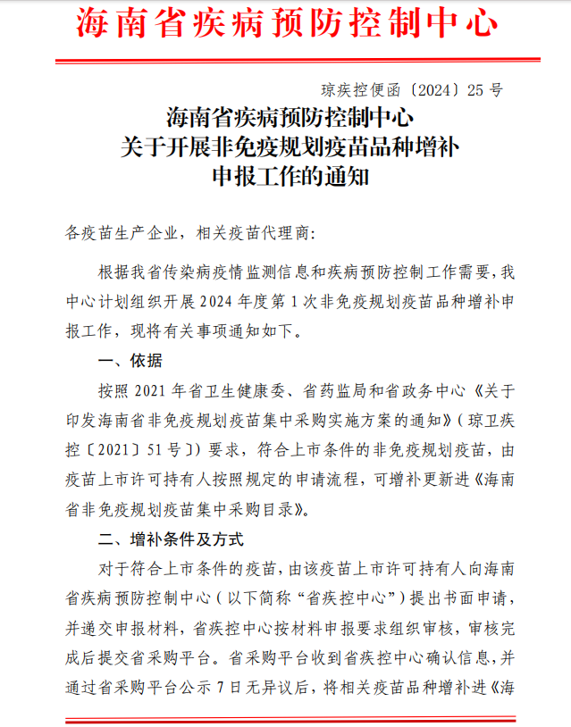 【海南】海南省疾病预防控制中心关于开展非免疫规划疫苗品种增补申报工作的通知