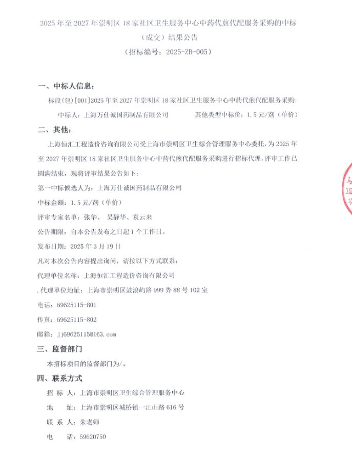 【上海市崇明区卫生综合管理服务中心】上海市2025年至2027年崇明区18家社区卫生服务中心中药代煎代配服务采购的中标(成交)结果公告
