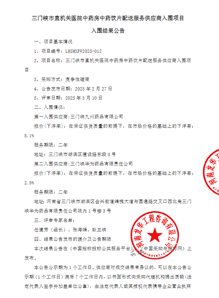 【三门峡市直机关医院】河南省三门峡市直机关医院中药房中药饮片配送服务供应商入围项目-入围结果公告