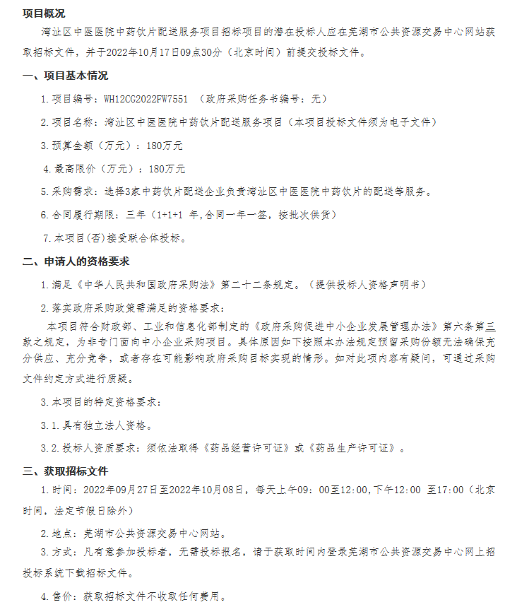 【安徽省芜湖市湾沚区中医医院】中药饮片配送服务项目公开招标公告