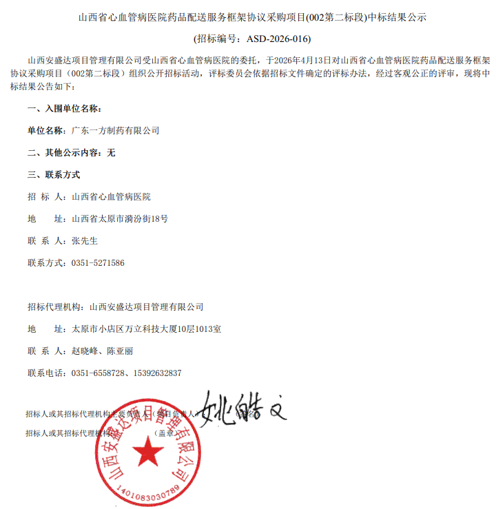 【山西省心血管病医院】山西省心血管病医院药品配送服务框架协议采购项目(002第二标段)中标结果公示