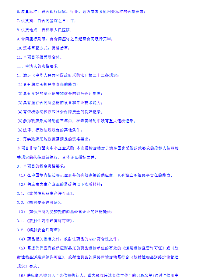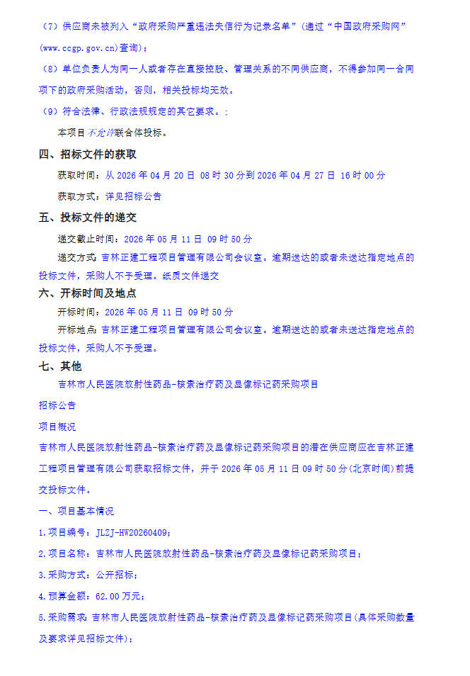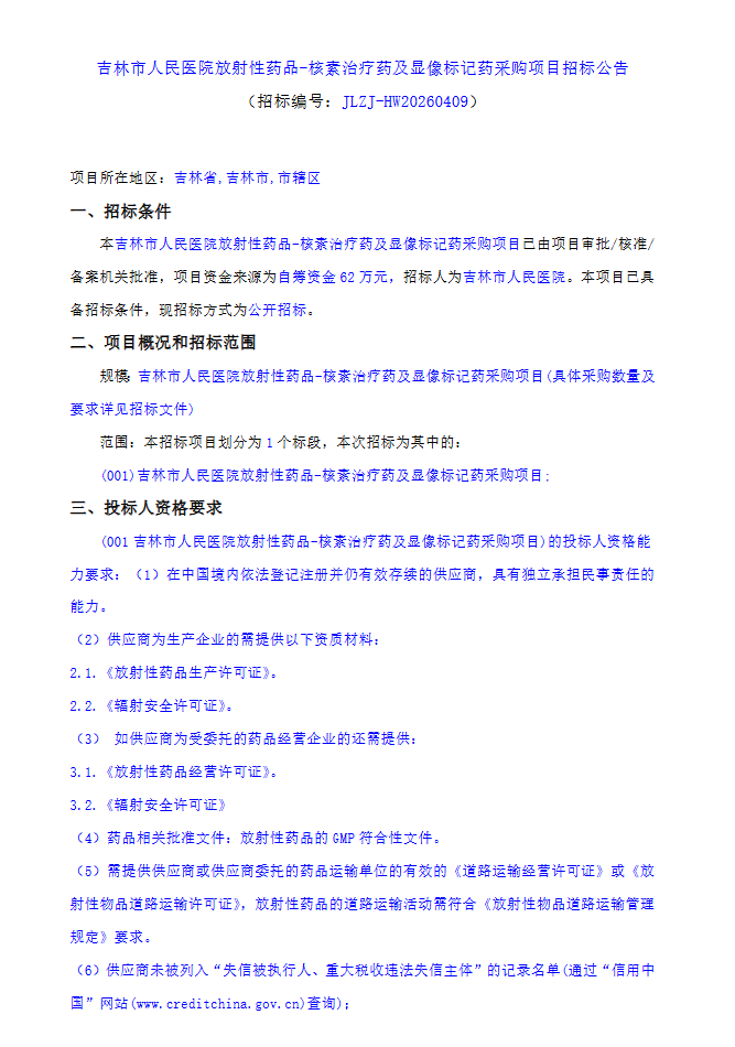 【吉林市人民医院】吉林省吉林市人民医院放射性药品-核素治疗药及显像标记药采购项目招标公告