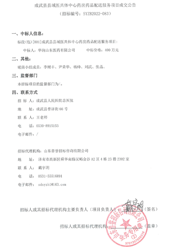【成武县县域医共体中心】成武县县域医共体中心药房药品配送服务成交公告