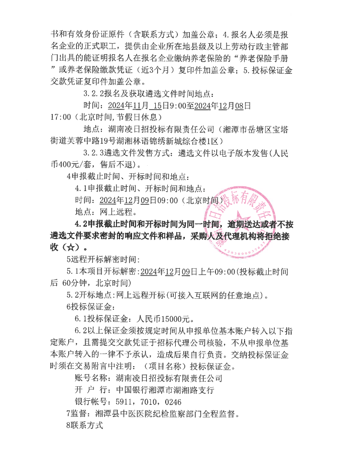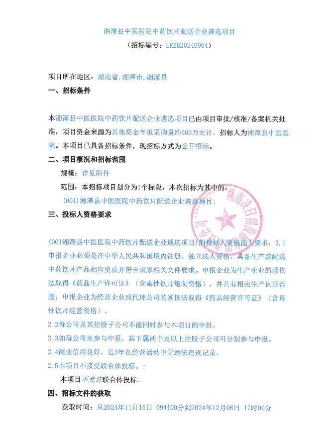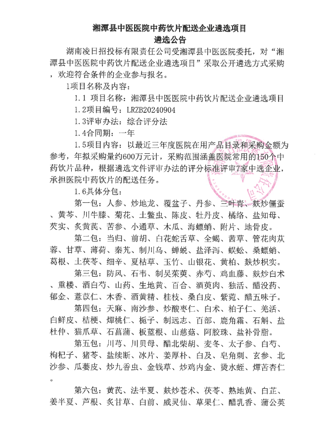 【湘潭市湘潭县中医医院】湖南省湘潭市湘潭县中医医院中药饮片配送企业遴选项目