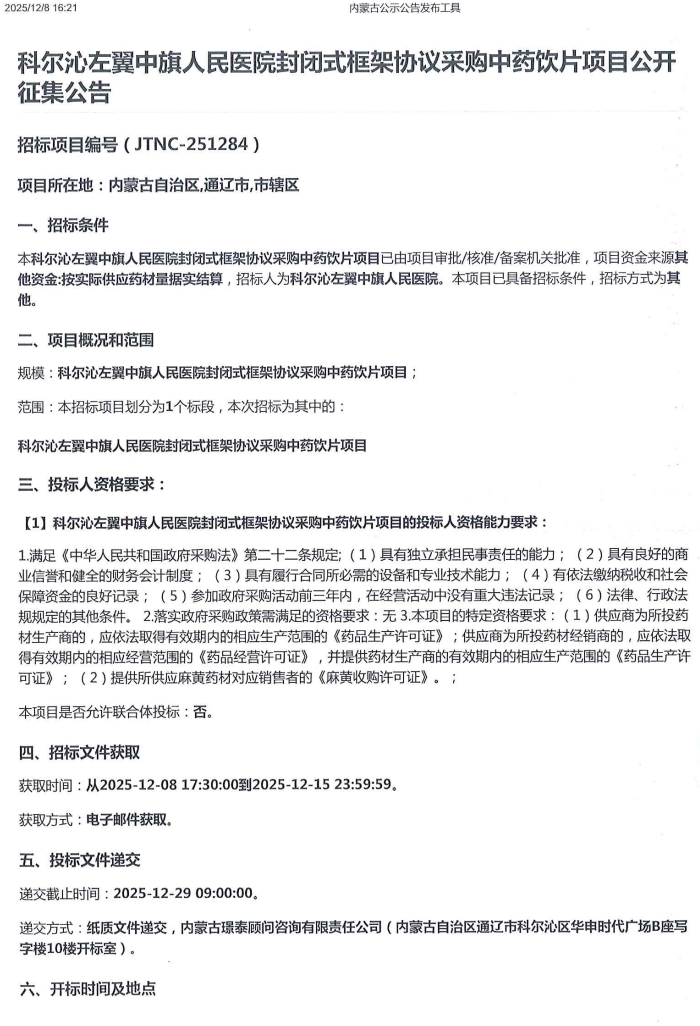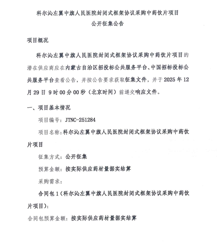 【通辽市科尔沁左翼中旗人民医院】内蒙古自治区通辽市科尔沁左翼中旗人民医院封闭式框架协议采购中药饮片项目公开征集公告