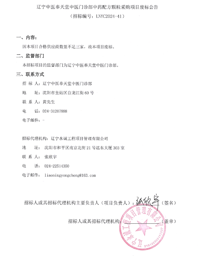 【辽宁中医奉天堂中医门诊部】辽宁中医奉天堂中医门诊部中药配方颗粒采购项目废标公告