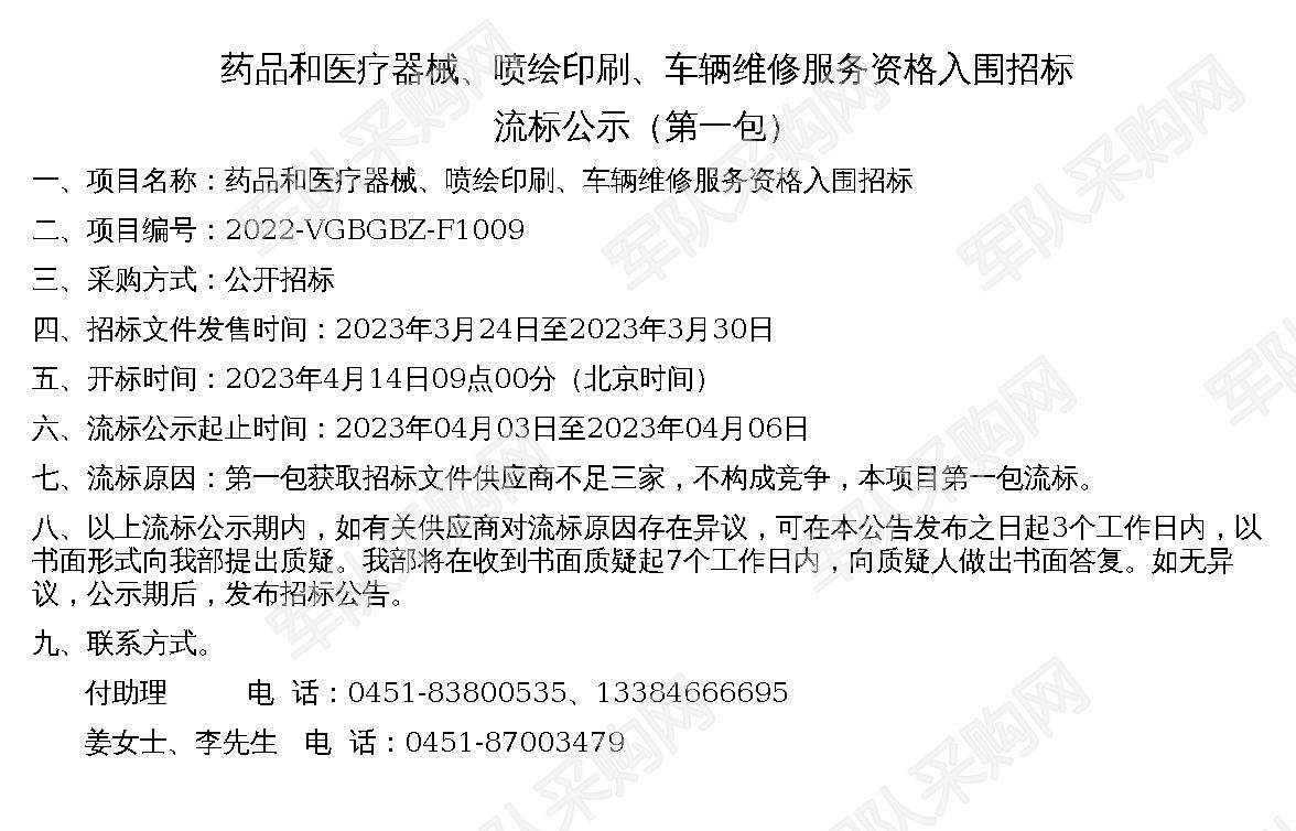 【军队采购】军队采购网药品和医疗器械、喷绘印刷、车辆维修服务资格入围招标流标公示(第一包)(2022-VGBGBZ-F1009)(20230331)