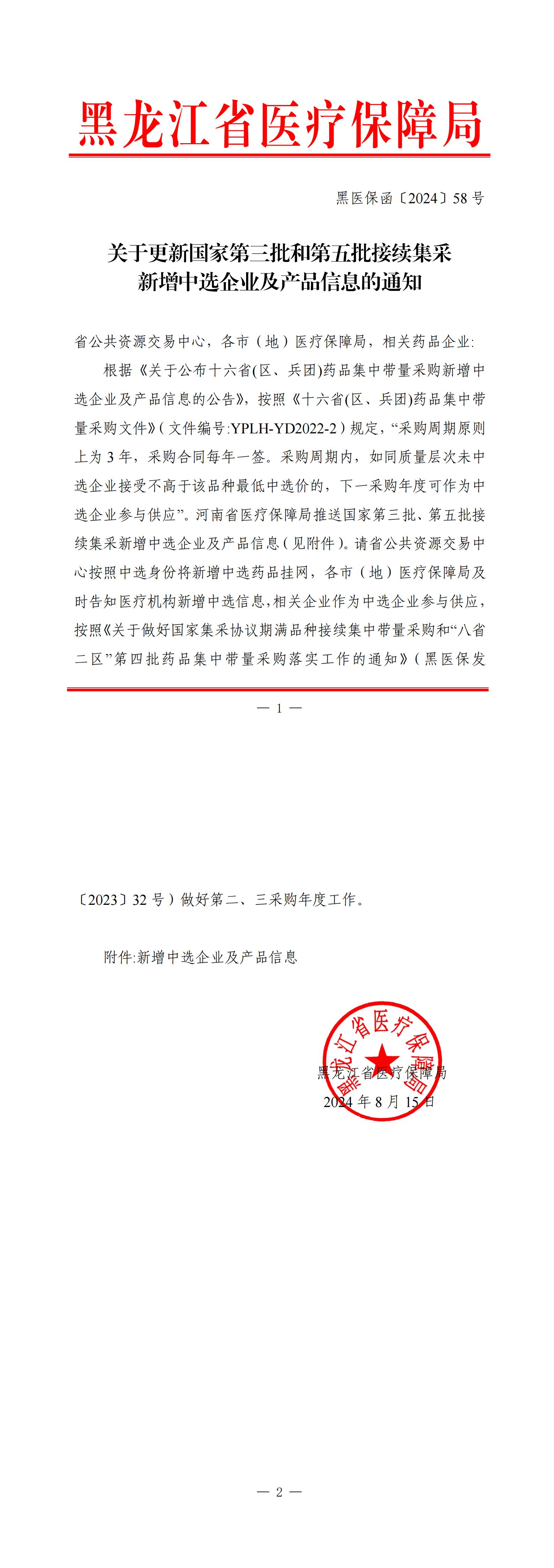 【黑龙江】黑龙江省关于国家第三批、第五批接续集采新增中选企业及产品信息的通知