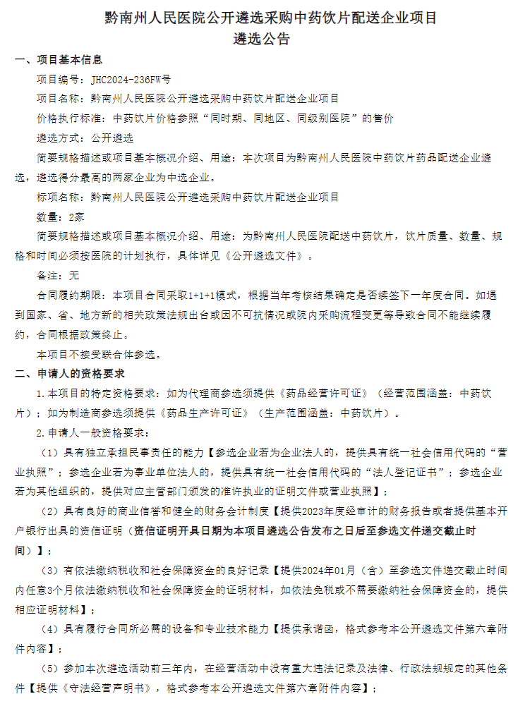 【黔南州人民医院】贵州省黔南州人民医院公开遴选采购中药饮片配送企业项目遴选公告