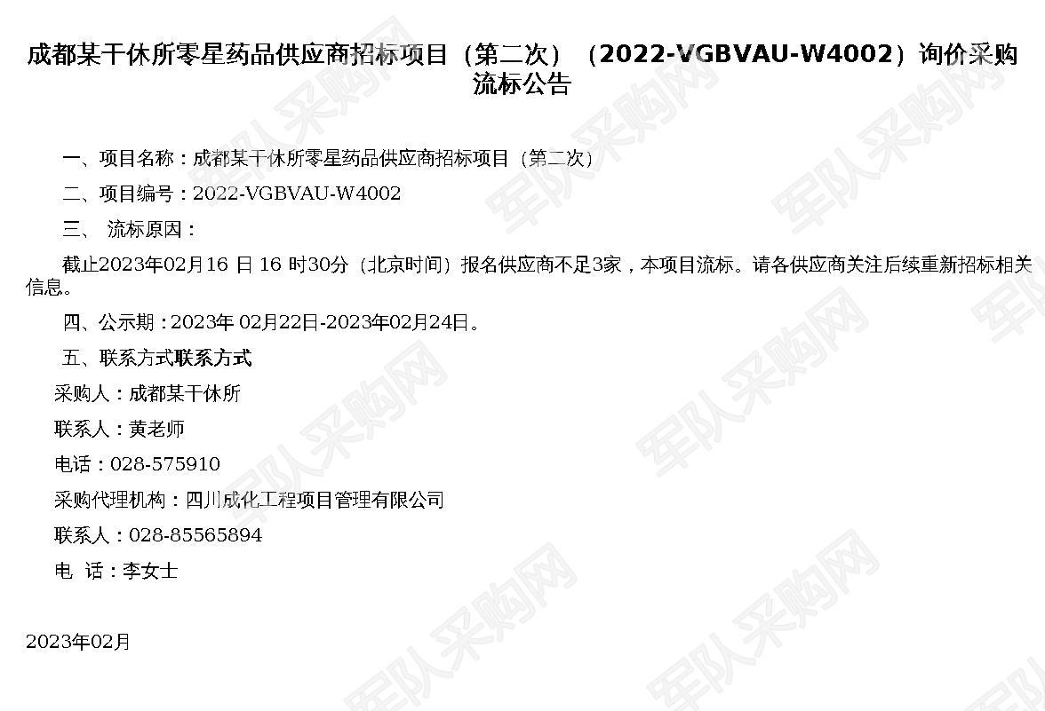 【军队采购】军队采购网成都某干休所零星药品供应商招标项目(第二次)询价采购流标公告(2022-VGBVAU-W4002)