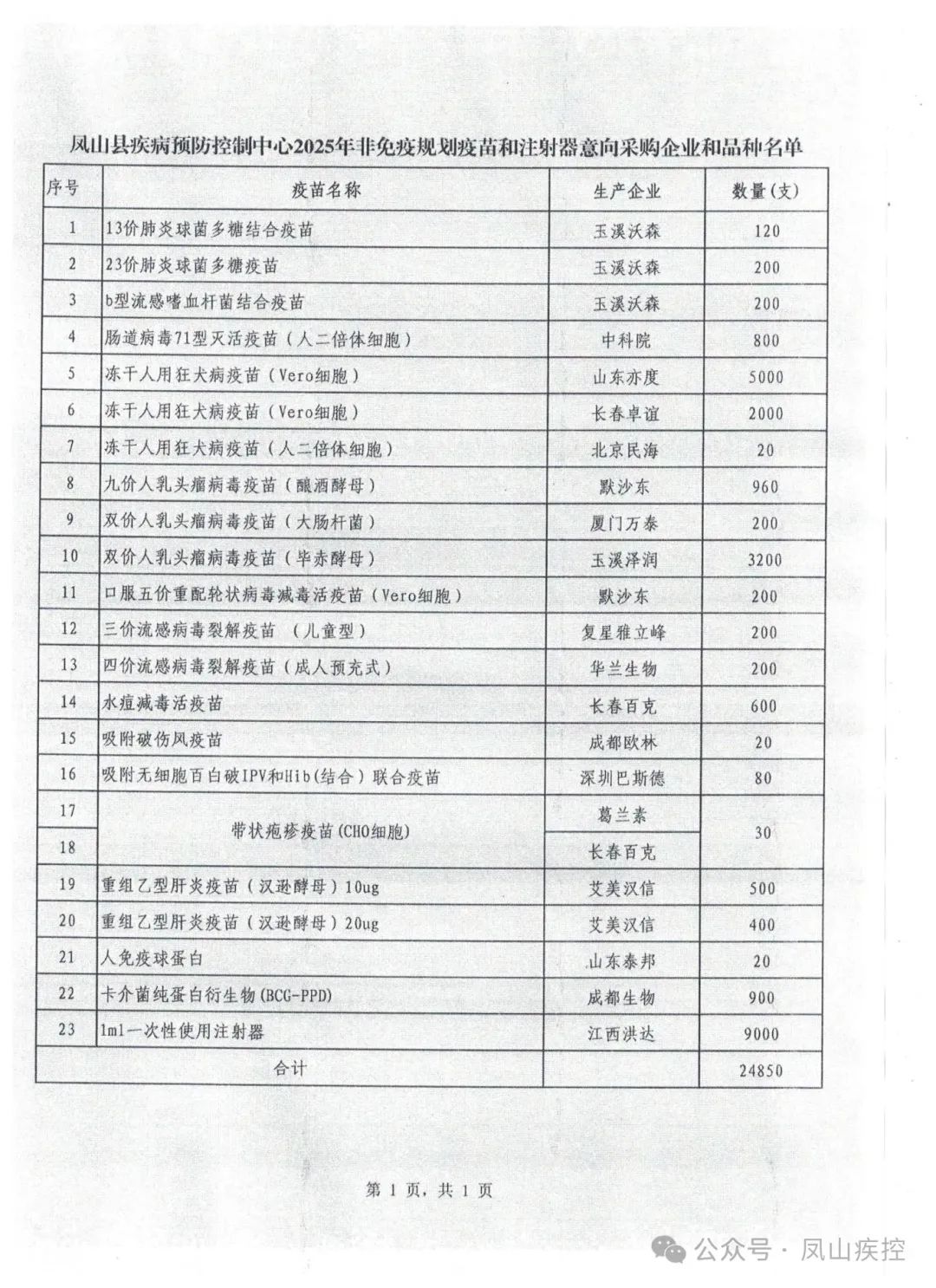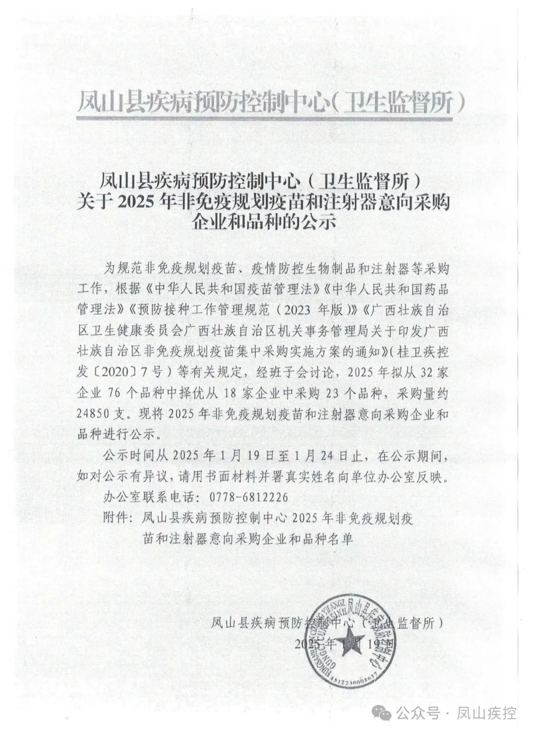 【河池】凤山县疾病预防控制中心(卫生监督所)关于2025年非免疫规划疫苗和注射器意向采购企业和品种的公示
