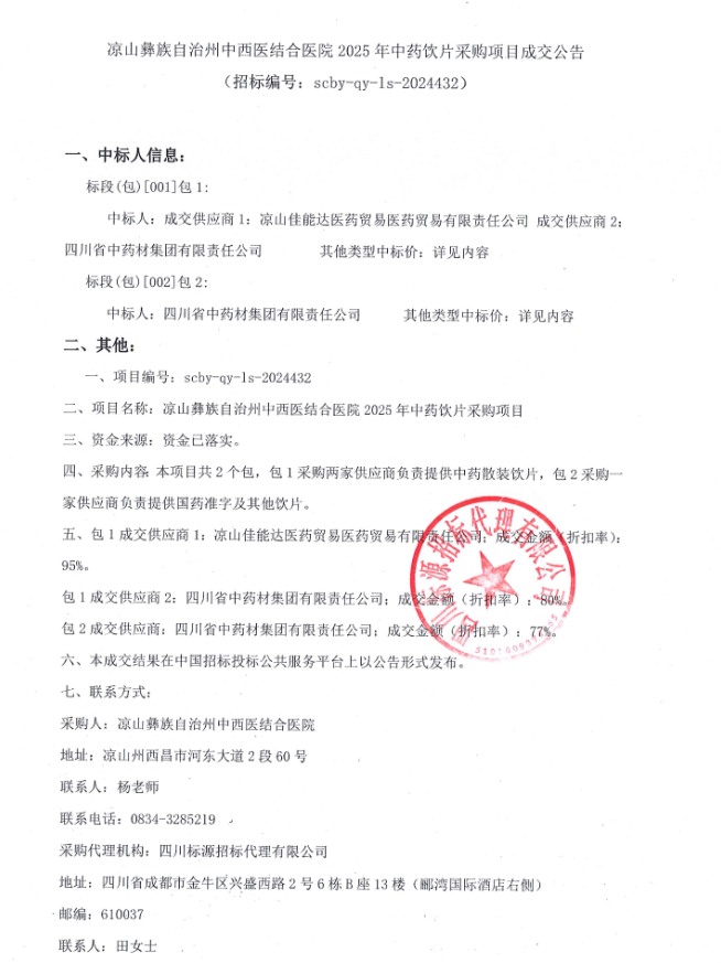 【凉山彝族自治州中西医结合医院】四川省凉山彝族自治州中西医结合医院2025年中药饮片采购项目成交公告