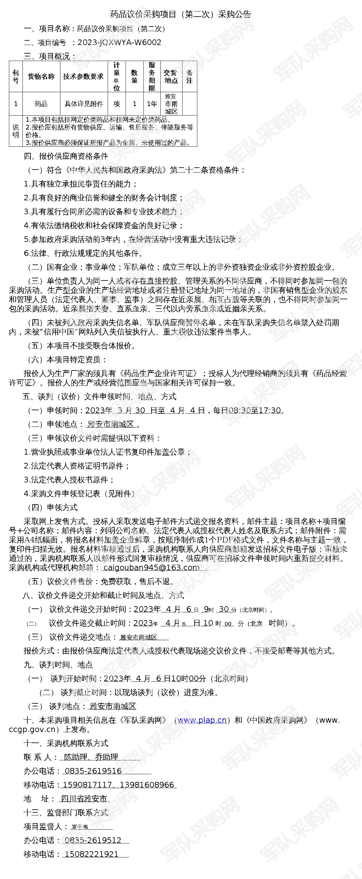 【军队采购】军队采购网药品议价采购项目采购公告(第二次)(2023-JQXWYA-W6002)