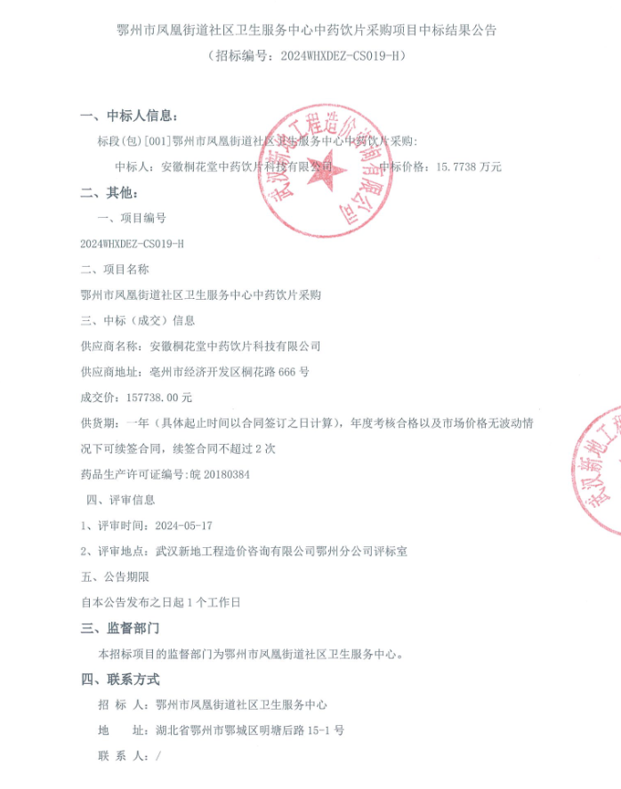 【鄂州市凤凰街道社区卫生服务中心】湖北省鄂州市凤凰街道社区卫生服务中心中药饮片采购项目中标结果公告