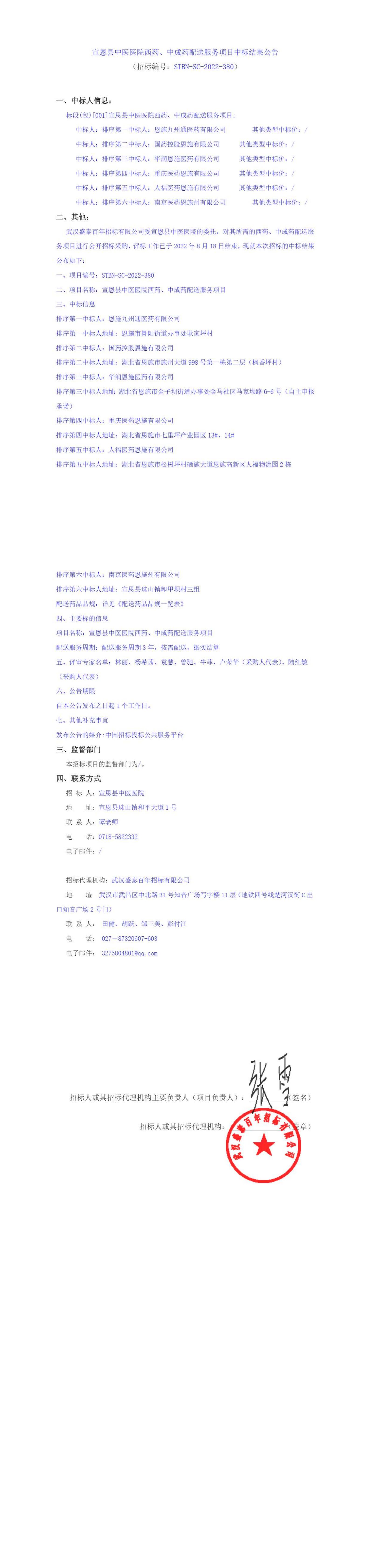 【宣恩县中医医院】宣恩县中医医院西药、中成药配送服务项目中标结果公告