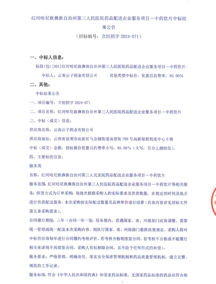【红河哈尼族彝族自治州第三人民医院】云南省红河哈尼族彝族自治州第三人民医院药品配送企业服务项目-中药饮片中标结果公告