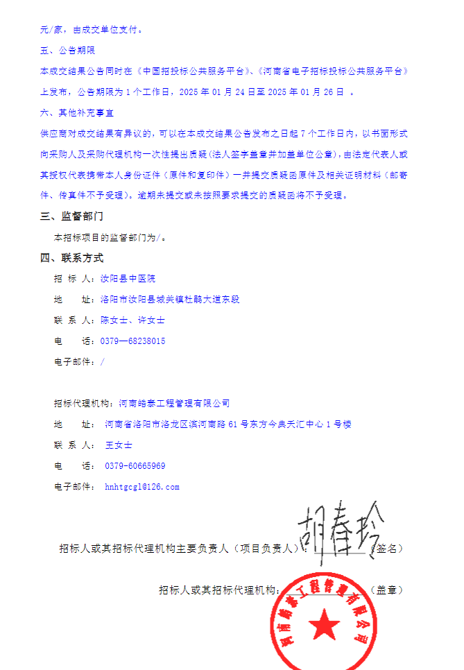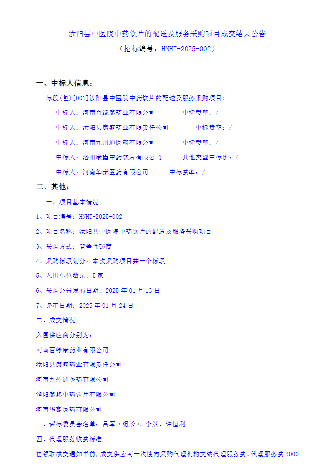 【洛阳市汝阳县中医院】河南省洛阳市汝阳县中医院中药饮片的配送及服务采购项目成交结果公告